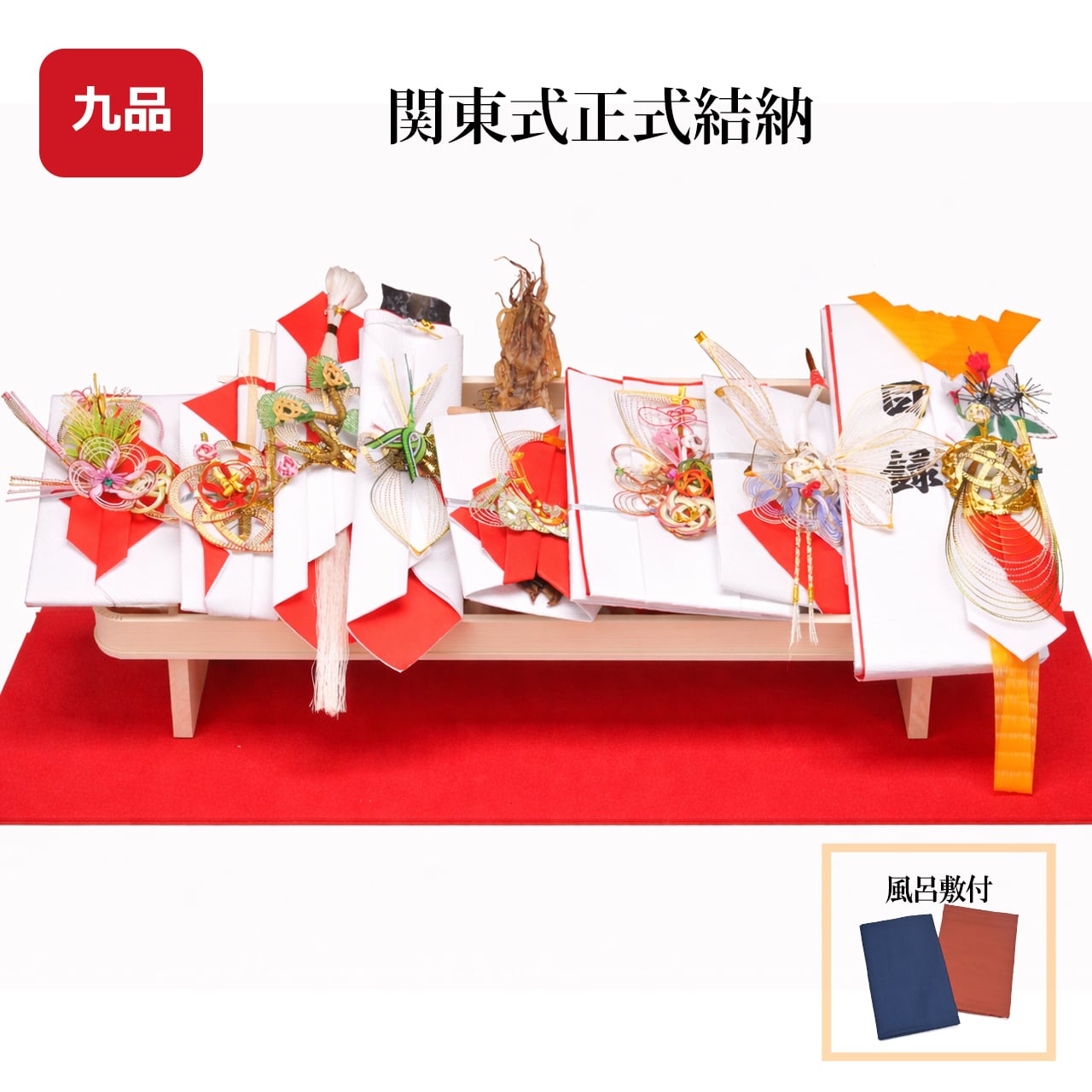 結納九品は関東式における正式な結納のかたちであり、縁起物九品を整えご両家の末永い繁栄とご縁を丁重に結ぶ伝統的な儀礼一式です。