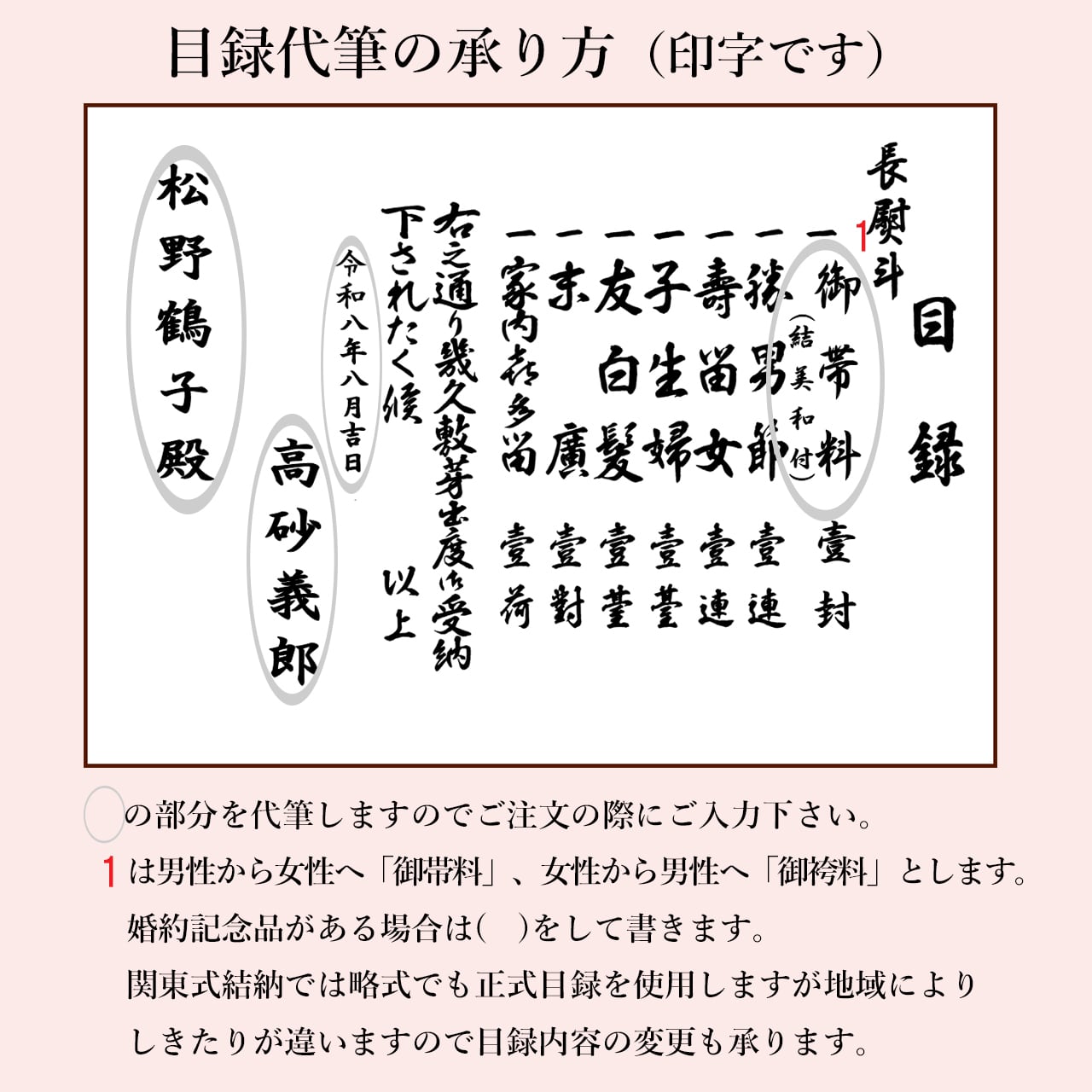 目録、受書、金封中袋(結納金、家内喜多留)の代筆を承りますのでご注文の際にご入力下さい。(パソコンによる印字です)