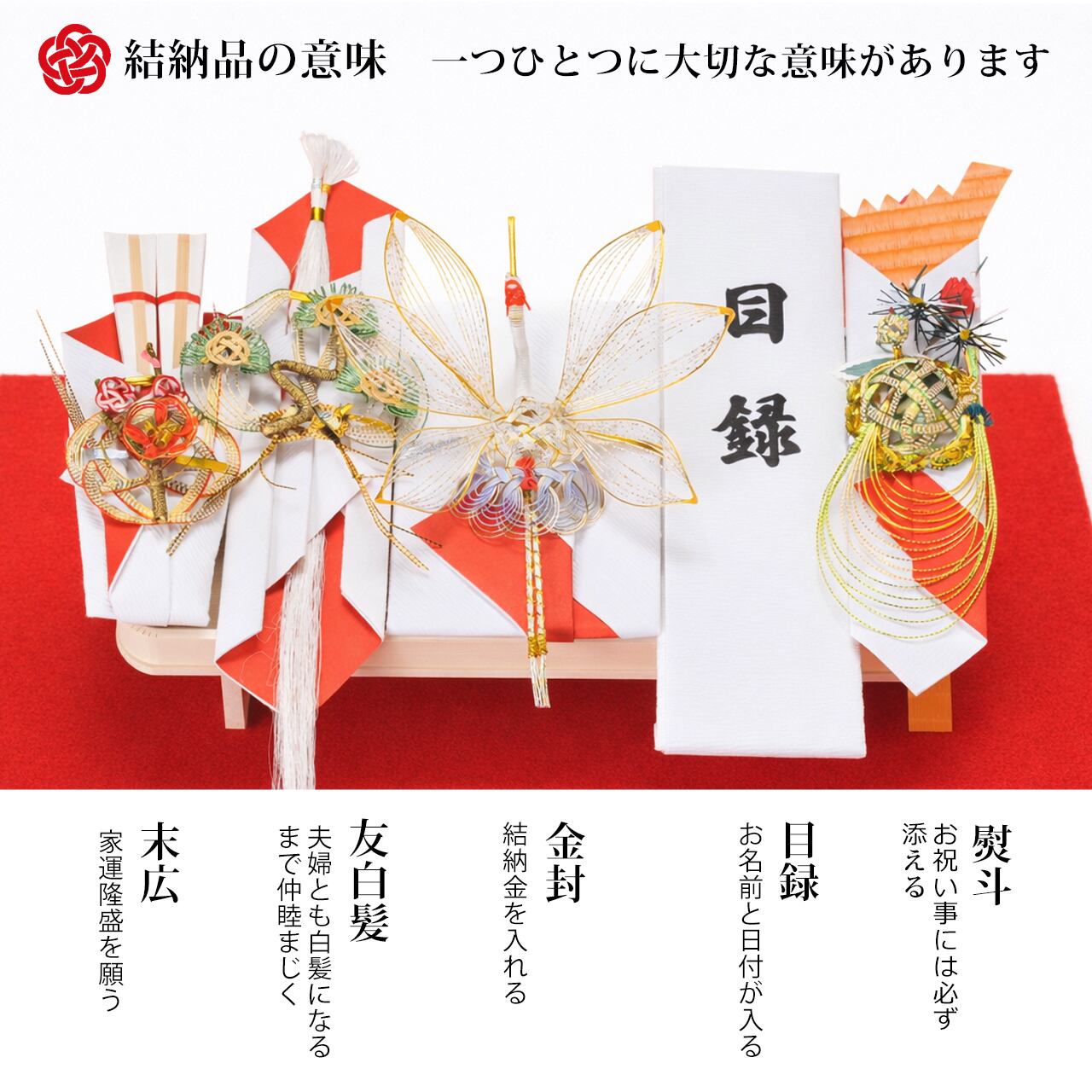 長熨斗、目録、結納金包、友白髪、末広、白木台、